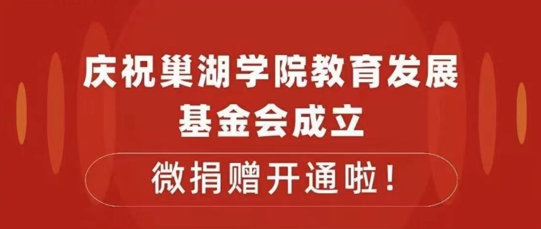 廣大校友、社會各界愛心人士:湯山腳下,四十七載薪火傳;滋瀾池邊,弦歌不輟滿庭芳。2024年10月14日,我們將迎來建校47周年華誕。回首崢嶸歲月,學校的建設與發展離不開廣大師生的默默耕耘,更離不開廣大校友的反哺饋贈和社會各界的赤誠惠教。在此,我們向您表達最崇高的敬意和最衷心的感謝!助學興校,惠澤千秋,結草銜環,功垂大宇。為緬懷創校歷程,展示發展成就,增強師生愛校情懷,發揮校史育人功能,學校擬于建校50周年前建成校史館。現面向關心學校建設發展的廣大校友、社會各界人士,發起校史館捐贈倡議,誠摯邀請您加入到捐資助學的行列中來,凝心聚力,共繪新篇。一、捐贈目標募集校史館項目資金人民幣500萬元。個人(單位)捐贈金額不限,可以是47、470、4700......等以47為基數的倍數金額。二、捐贈方式1.通過基金會公司賬戶進行捐贈。用戶名:巢湖學院教育發展基金會人民幣賬號:349210000013000067106開戶行:中國交通公司巢湖分行備注:轉賬請標注“電話+校史館捐贈”2.通過掃描下方二維碼捐贈。請在備注中填寫“姓名+電話+校史館捐贈”,以便我們能夠更好的感謝您!3.線下捐贈。請到巢湖學院